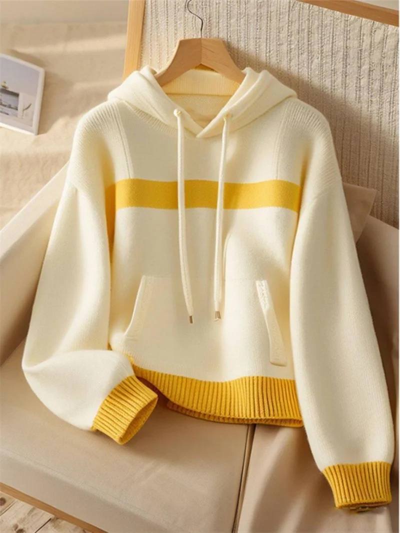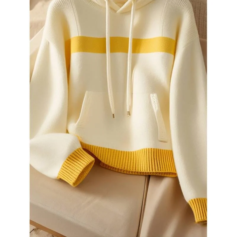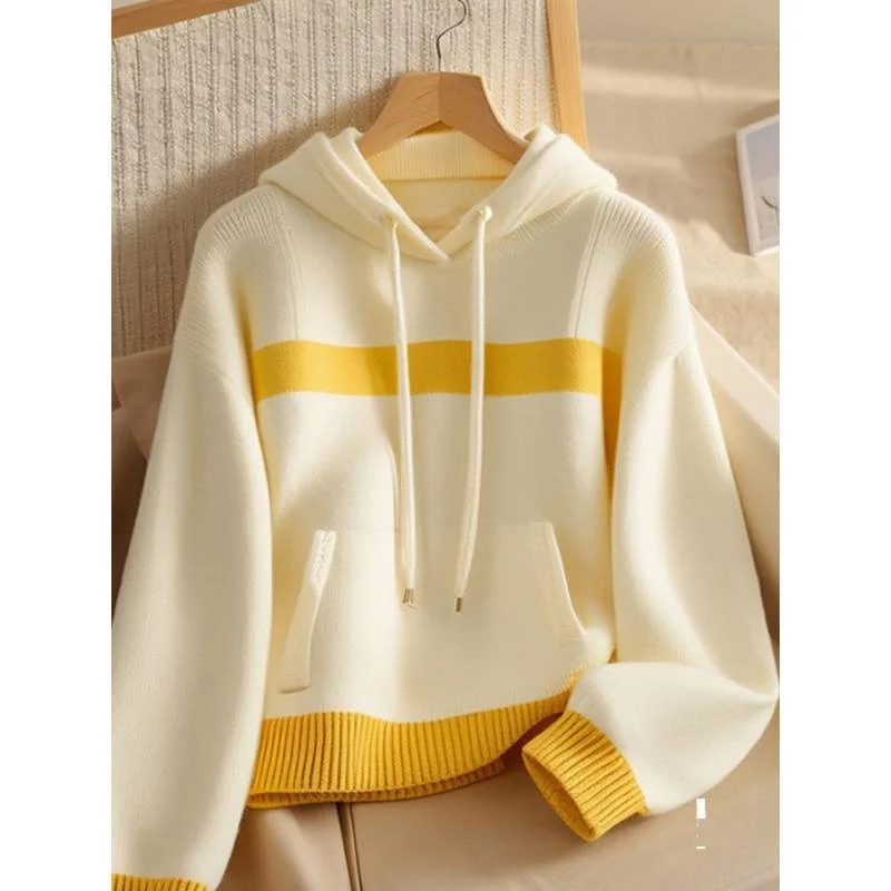 Women Sweater Hooded Knitwear Tops Ladies Pullover Yellow-white Stitching